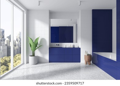 シンクと虚栄心と白と青のタイルのバスルームのインテリア、サイドテーブルとアクセサリー付きの浴槽、明るい花崗岩の床に植物。ニューヨークの高層ビルのパノラマウィンドウ。3Dレンダリング」のイラスト素材2359509717Shutterstock。