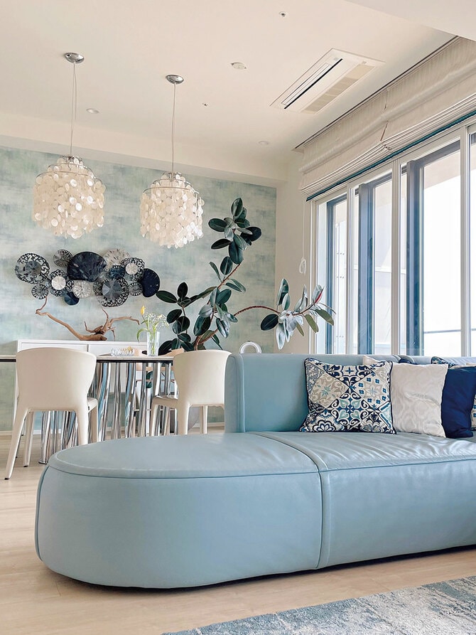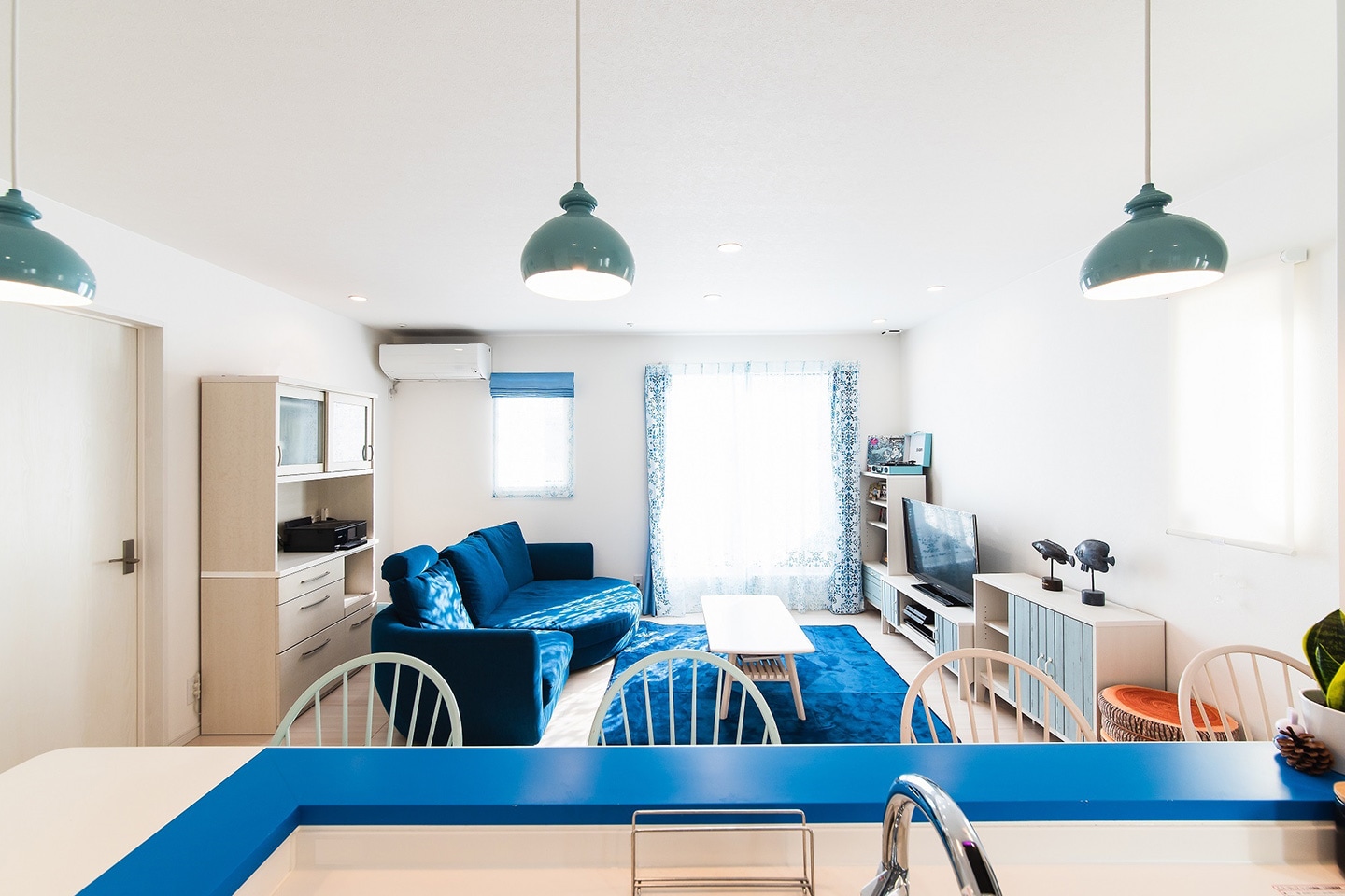 ブルーインテリア 日々の疲れも吹き飛ぶハイセンス夫婦のリビングカヴァースインテリア。