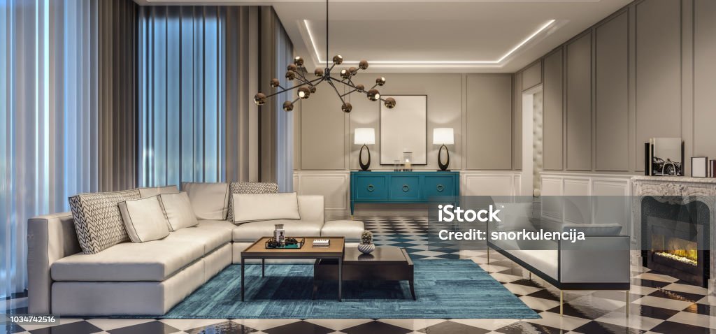 青のアクセントと黒と白のタイルでモダンなインテリア デザインのリビング ルーム - 居間のストックフォトや画像を多数ご用意 - 居間, 屋内, 優雅- iStock。