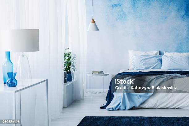 白と青の装飾ダブルベッドの壁紙とリラックスできる寝室のインテリア - 寝室のストックフォトや画像を多数ご用意 - 寝室, 青, まぶしい -iStock。