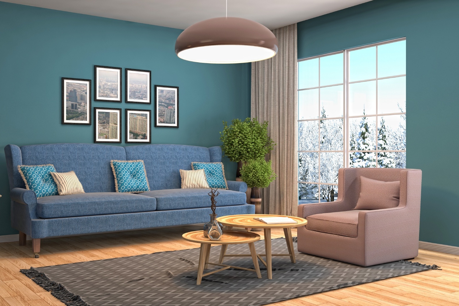 青と白のリビングルームのインテリアにソファ、アームチェア、ポスター、カーテンの写真素材・画像素材 Image 97854893。