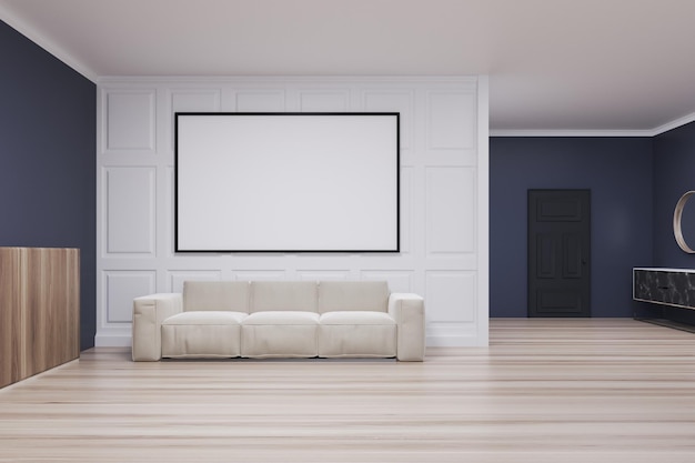 青と白のリビング ルームのインテリアに木の床、ドア、柔らかい白いソファの上に水平のポスターが付いています。 3D レンダリングのモックアップPremium写真。