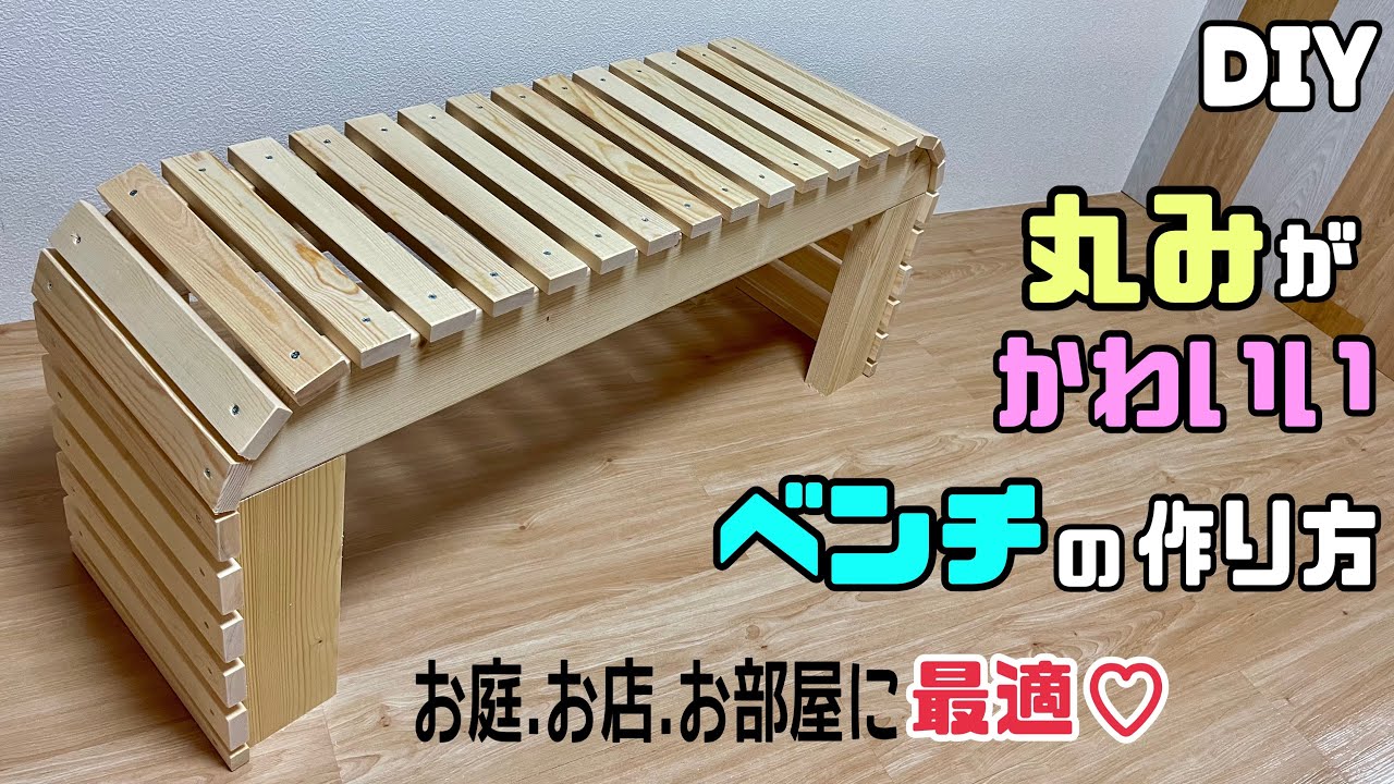 DIYベンチ 丸みがかわいいベンチの作り方!!お店、お部屋、お庭にあるとオシャレ!!強度も安定もバツグンです!!脚の留め方にもポイント、コツがあります!! diyベンチ マルノコ イス。