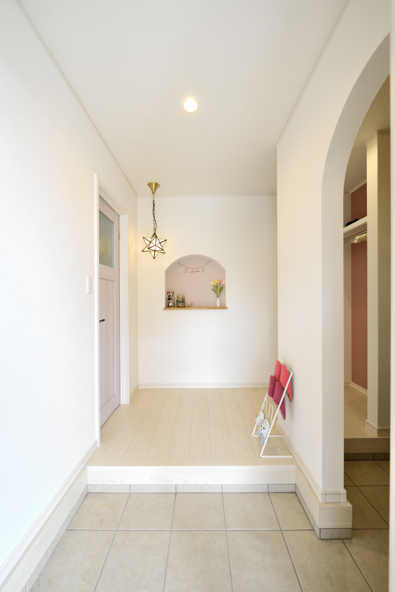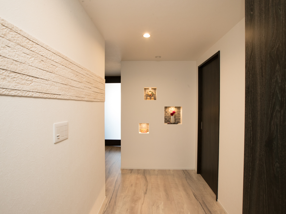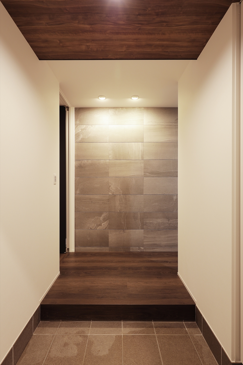 玄関正面の飾り棚にはタイル張りと間接照明でアクセント。 上質な空間が家族やお客様を出迎えます。 - - - -玄関玄関インテリア飾り棚ニッチタイル張り玄関収納玄関ホールhousedesignmyhome新築戸建て施工事例モデルハウスタマホームモデル。