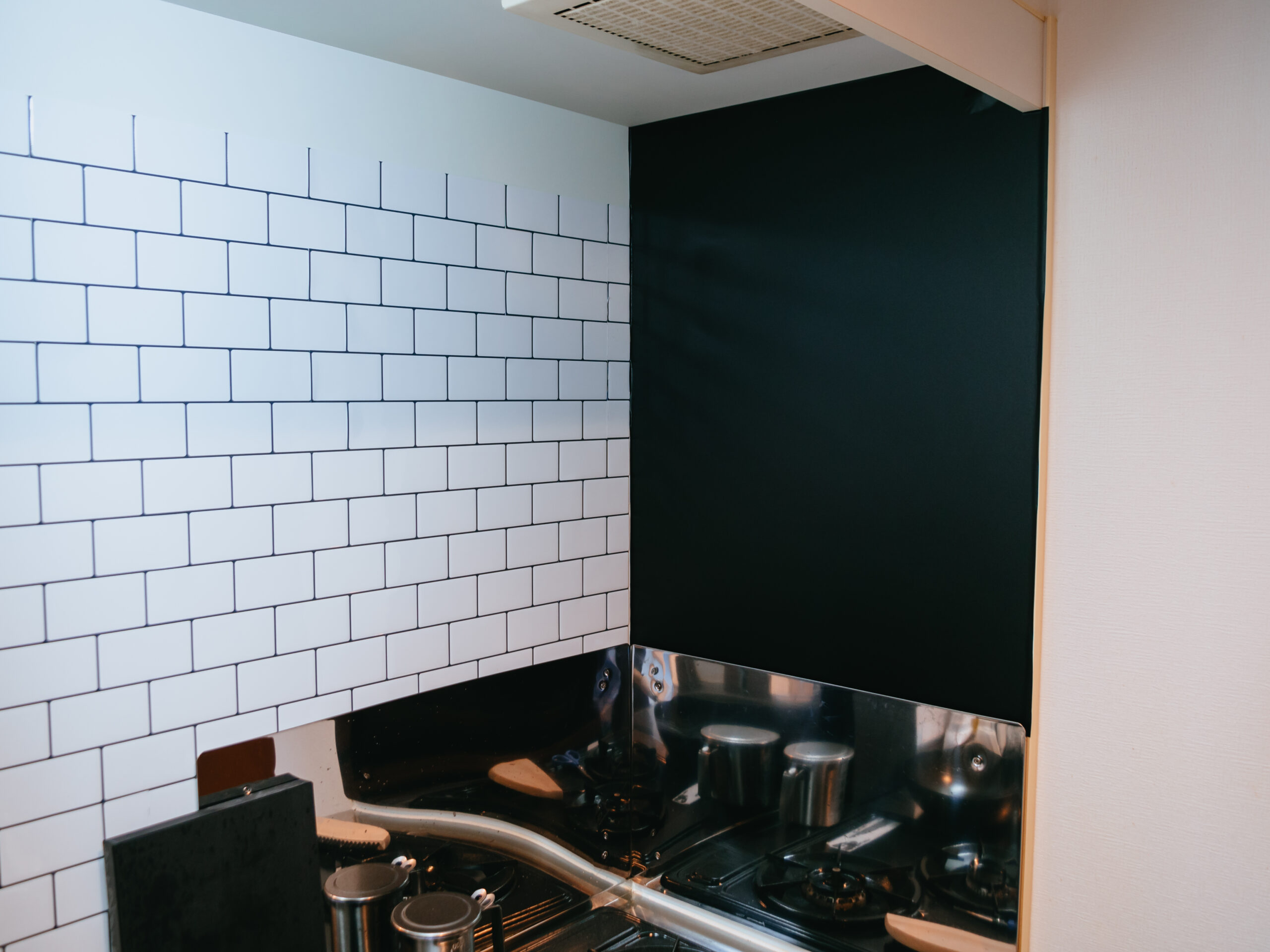 タイル調と黒の貼って剥がせるキッチン壁紙一人暮らしの賃貸マンション簡単DIY - インドア人事のこだわり。