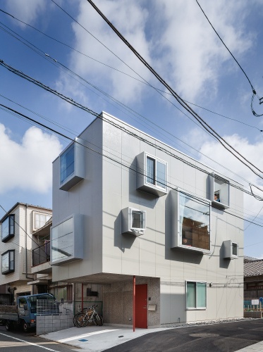 外観正面夕景 室内の風景が出窓に切り取られて外部に表れる 蔵前の小さな家- 外観事例SUVACO スバコ。