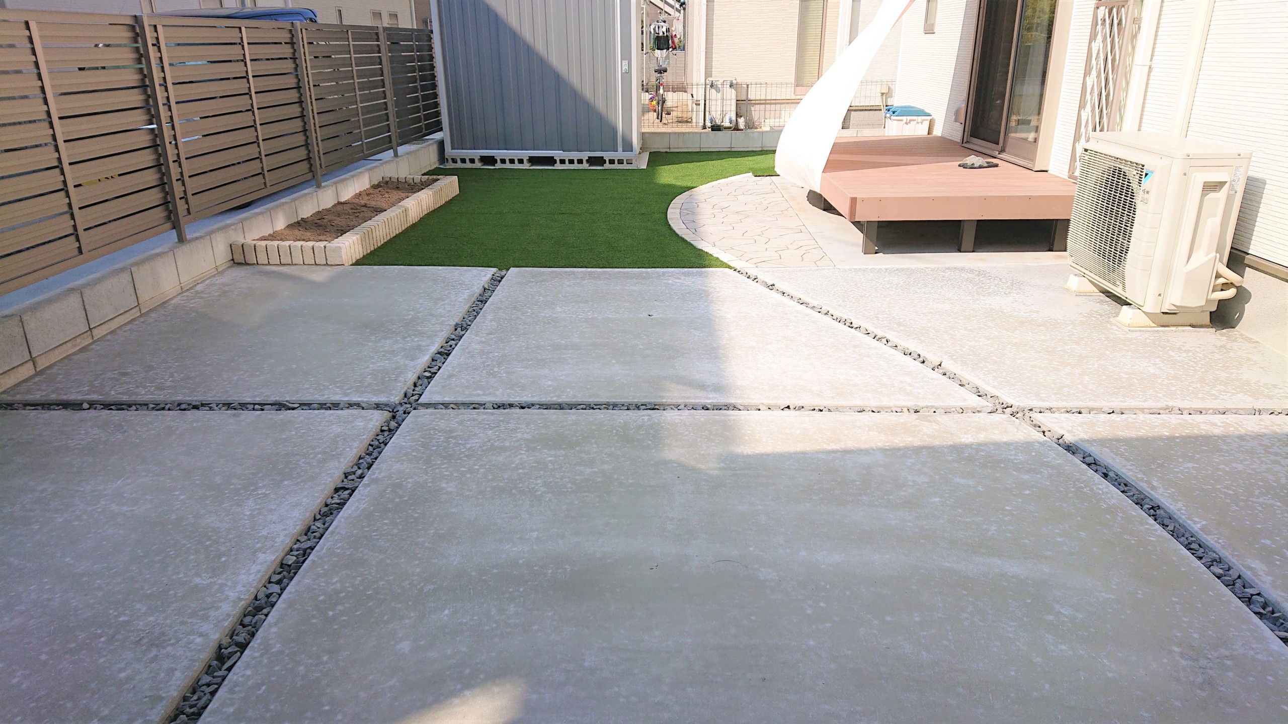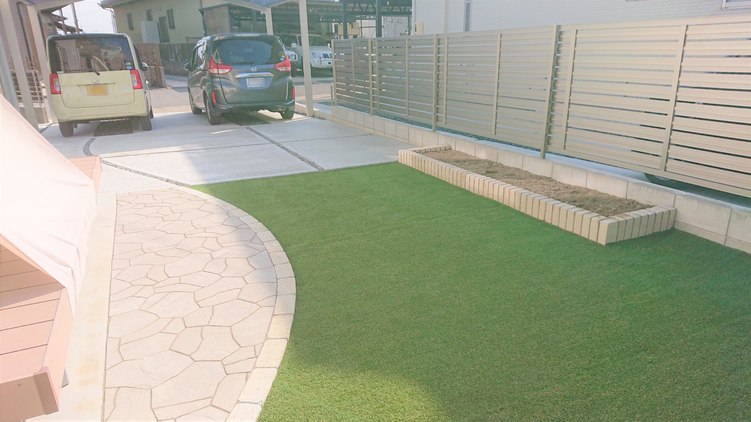 土間コンクリートの駐車場を広くしてかわいい目地庭に人工芝を敷いて手入れが簡単でおしゃれでかわいい庭に目隠しフェンスの取付工事一宮市外構・エクステリア・造園は庭づくり専門店 愛知県扶桑町 池之上造園へ。