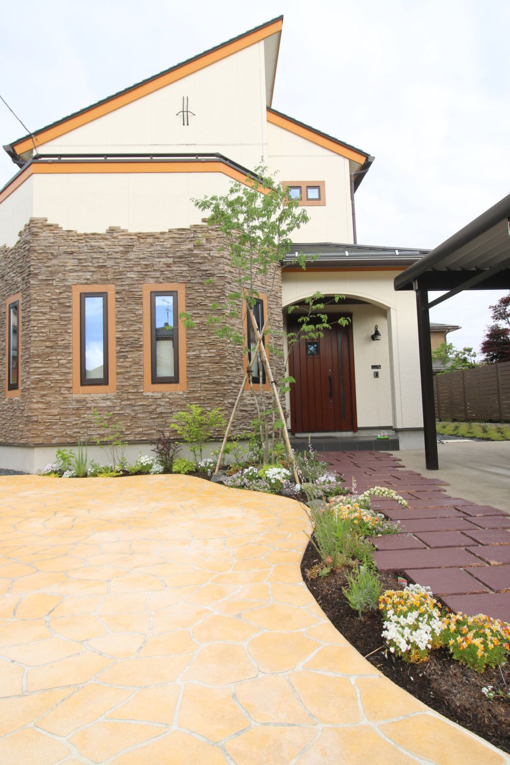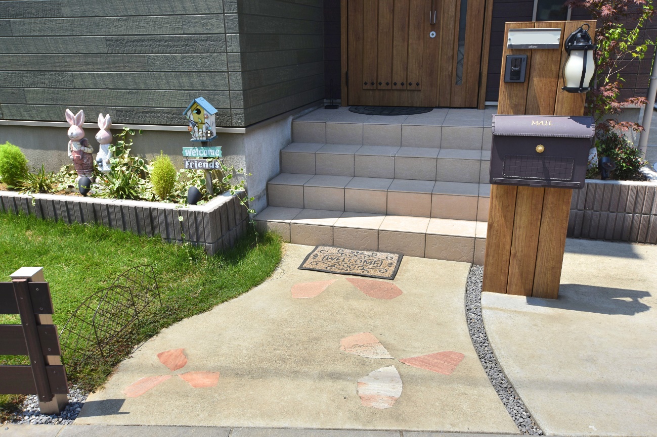 自然石風のスタンプコンクリート、植栽、ディーズガーデンアイテムでナチュラルかわいいフロントガーデン 備前市H様岡山で建材・エクステリアの事なら三井商会へ。