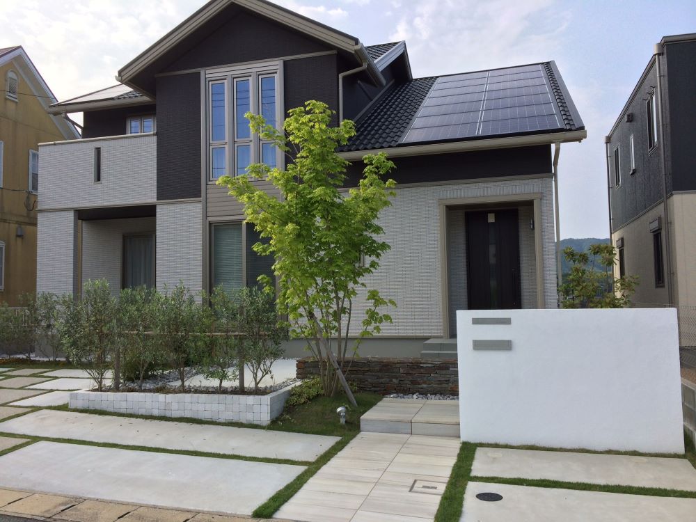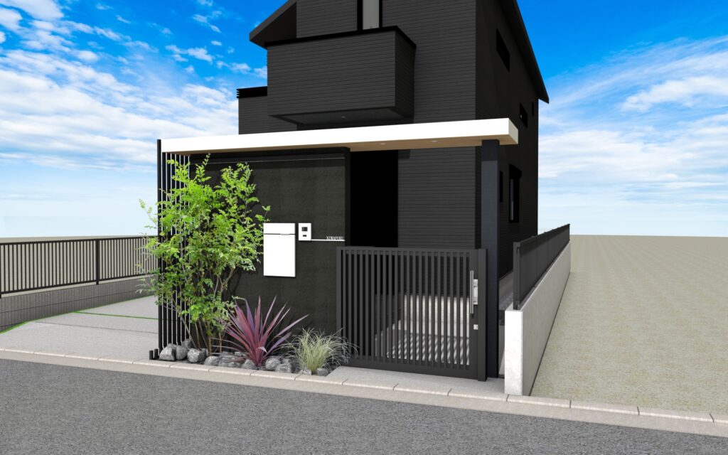施工例:和歌山市 外構工事 新築モダン オープン外構 玄関前雨除け屋根 レンガ花壇 駐車場ガレージ床 土間コンクリート 木製調デザインアルミ角柱シンボルツリー タイルデッキ 自転車バイク屋根 ヨド物置 犬走り 防犯砂利敷き。