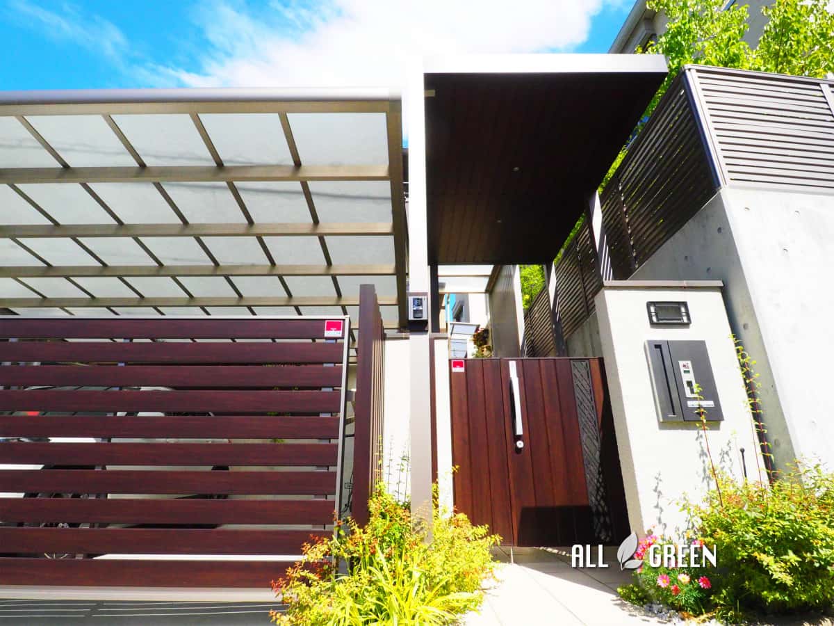 カーポートの屋根に高さを合わせ階段上をプラスGで屋根付きアプローチに_名古屋市千種区の新築外構ALLGREEN -庭・エクステリア・新築外構の専門店。