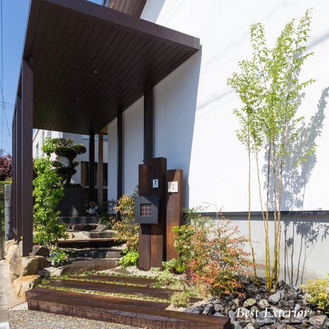 おしゃれモダンな玄関アプローチの仕上げ方 実例 タイルや枕木で外観にもこだわる新築玄関前スタイル不二建設。