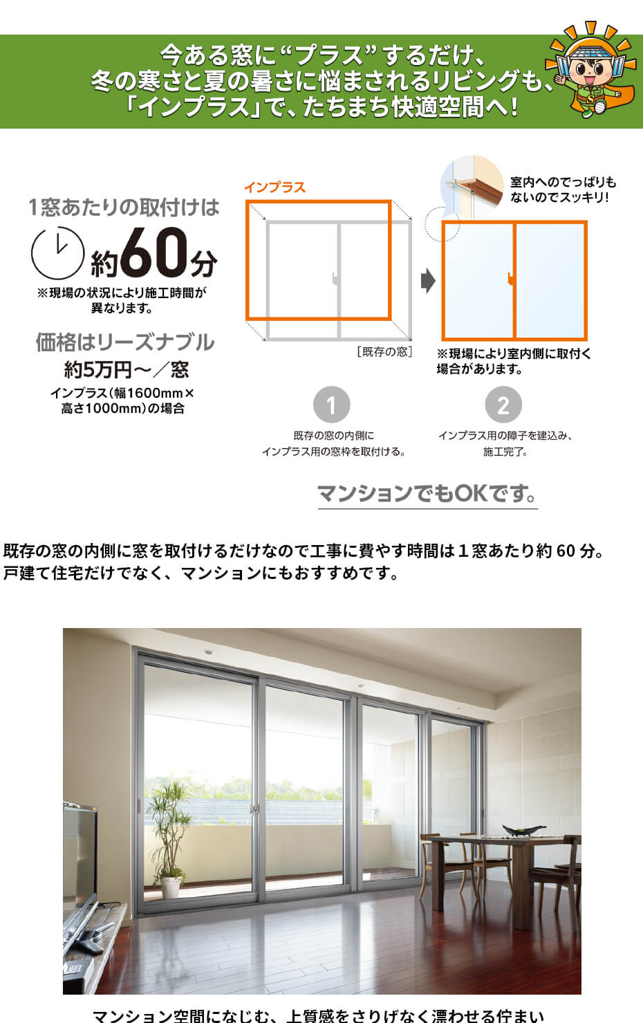 インプラス 引違い窓 2枚建 4mm型ガラス仕様 特注サイズ W:550~1,000mm × H:601~1,000mm 製品色:シ 内付二重サッシインプラス 引違い窓4枚建タイプリクシル を50%OFFの激安価格で施工販売 - 二重サッシならサンルーム.COM。