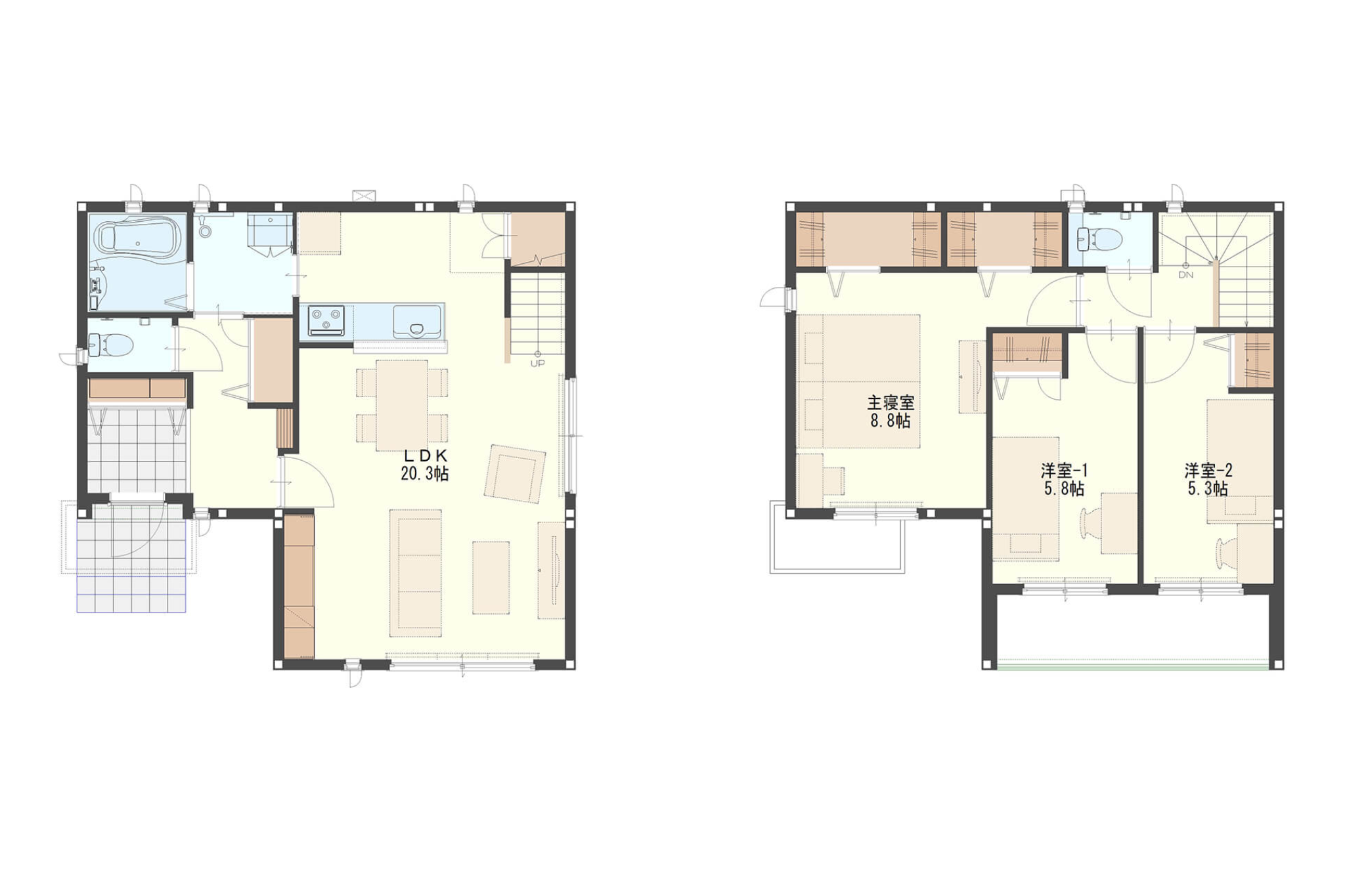 二人暮らしにちょうどいい家の間取り夫婦二人の小さな新築一戸建て事例、おすすめの間取りアイデア福井の注文住宅・工務店ノークホームズ。