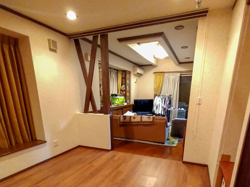 静岡市葵区の内装リフォーム事例 アンティークな筋交いがアクセントのリビング。