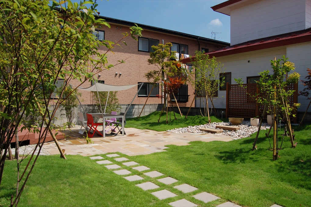 自然石と芝を敷き詰めた広い庭生活を豊かにする外での暮らしカントリーガーデン秋田の外構・ガーデンデザインエクステリア・リノベーション・不動産。