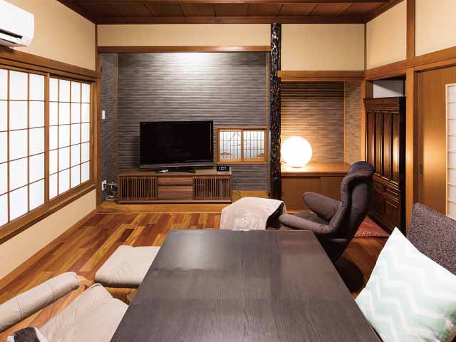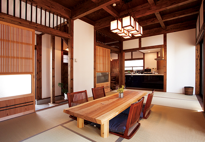 旅館や料亭を彷彿とさせる和室は、リビングとして使用。風を通す欄間は、旧家の桜の無垢材を再利用した くふうイエタテ。