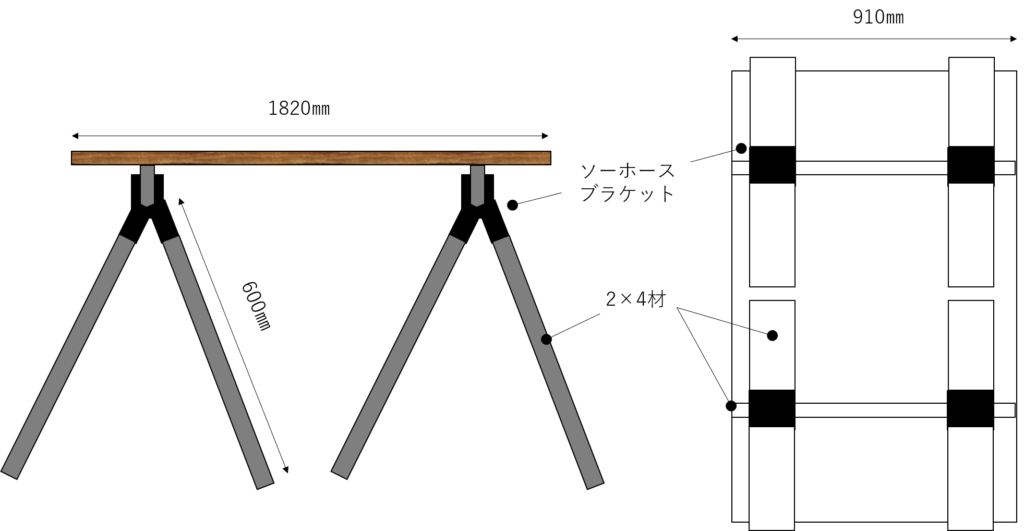 ソーホースブラケットとツーバイ材を使った馬 作業台 の作り方~手順と必要な材料。