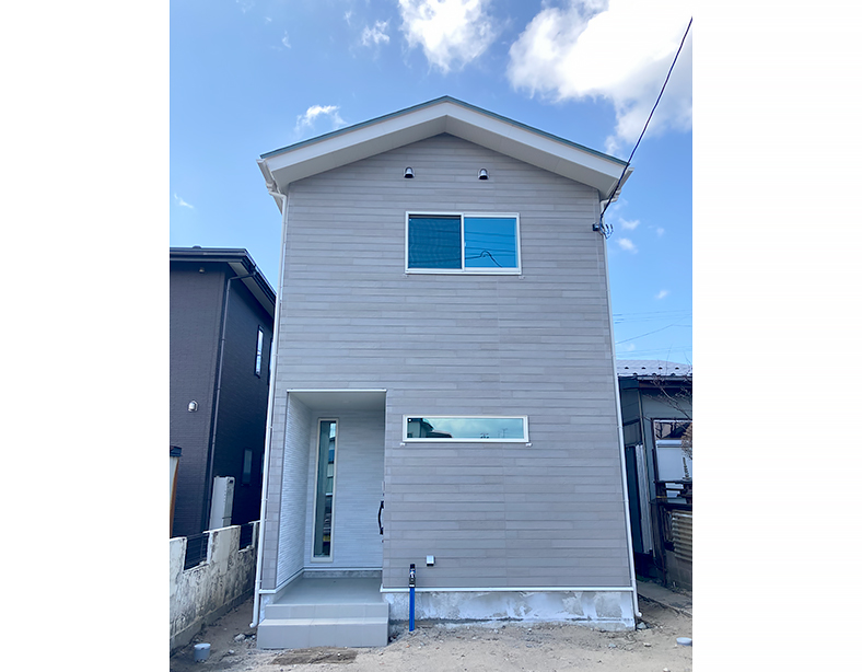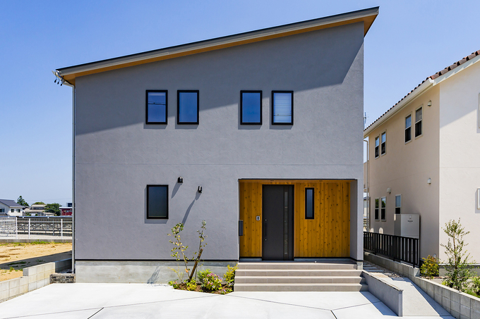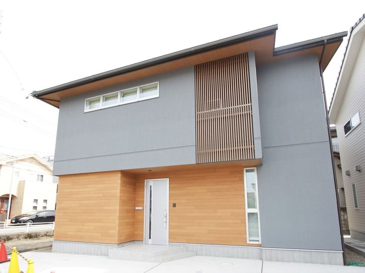 グレーの吹付×木目の明るい外観。格子のアクセントが目印です。