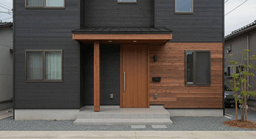 家の外観が「グレー×木目」のモダンでおしゃれな事例デザインのコツ、サイディング材の選び方も紹介豊橋市の工務店ならハピナイス。