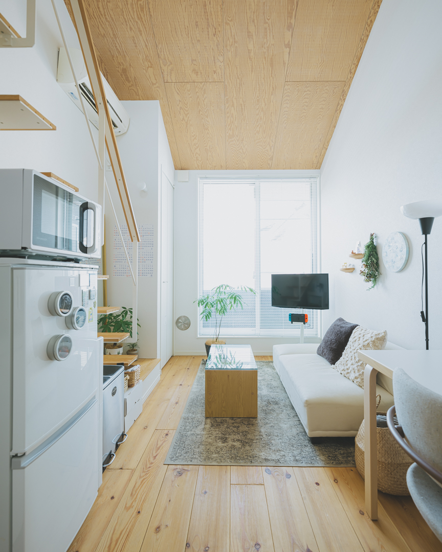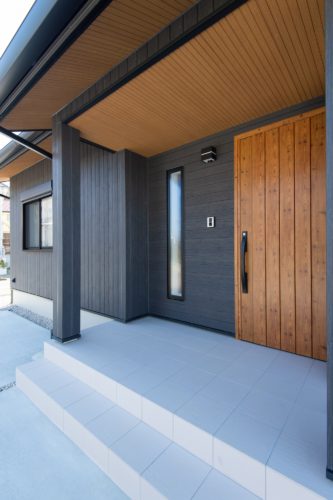 玄関ポーチには木目調のサイディングを用い、グレーの塗り壁の外観にアクセントをプラス。鉢植えを飾ったり、クリスマスツリーなど季節のディスプレイ。