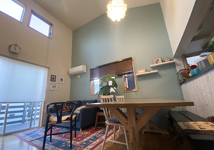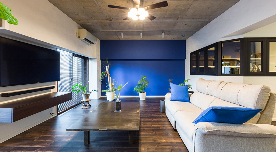 鮮やかなブルーのアクセントクロス 建築家とつくりあげた理想のリノベーション空間- リビングダイニング事例SUVACO スバコ。