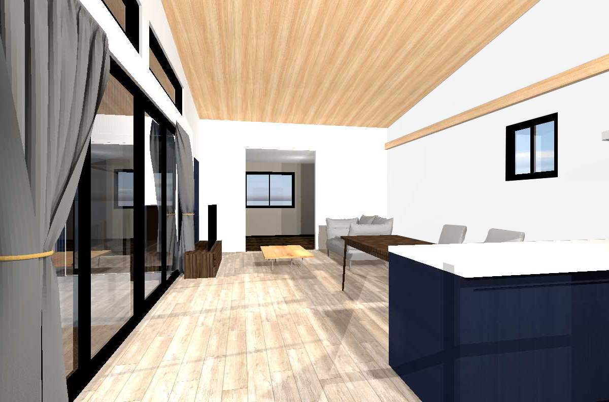 ネイビーの壁紙が落ち着いた西海岸のような雰囲気のリビング - 事例写真「成田モデルハウス×千葉県」注文住宅のハウスネットギャラリ。