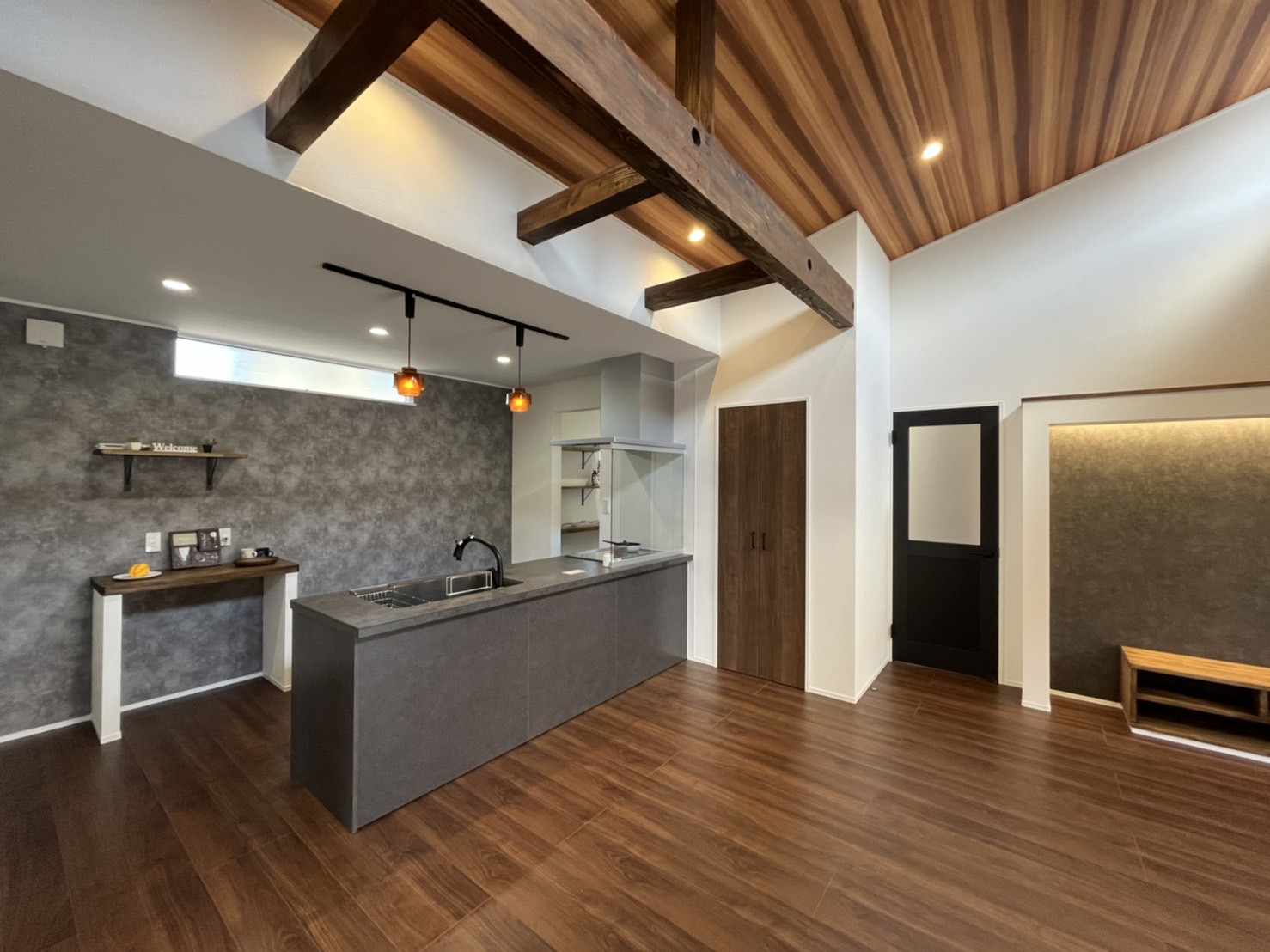 印象的なネイビーのアクセントクロスと造作扉 じっくり こっくり 味わい深く- リビングダイニング事例SUVACO スバコ。