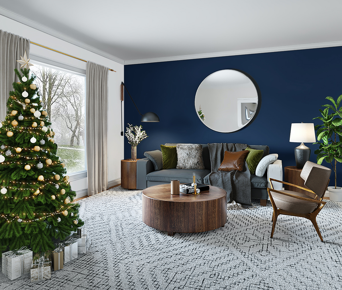 リビングルームの壁の装飾ダークブルー、芸術的なフレームの花とシックなアームチェア、コンクリート3Dレンダリング 背景 フリー素材JPG無料ダウンロード - Pikbest。