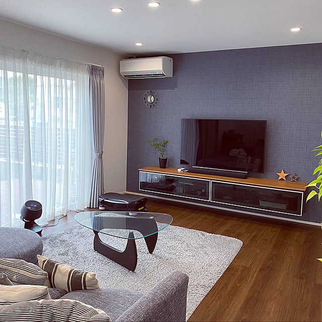 デニムの風合いのアクセントクロスと、ダークブラウンのフローリングとのコーディネートでスッキリ落ちた印象のリビングに仕上がりました@glanz_gallery .リビングリビングインテリアアクセントクロス壁紙サンゲツサンゲツクロスラシッサdパレット。