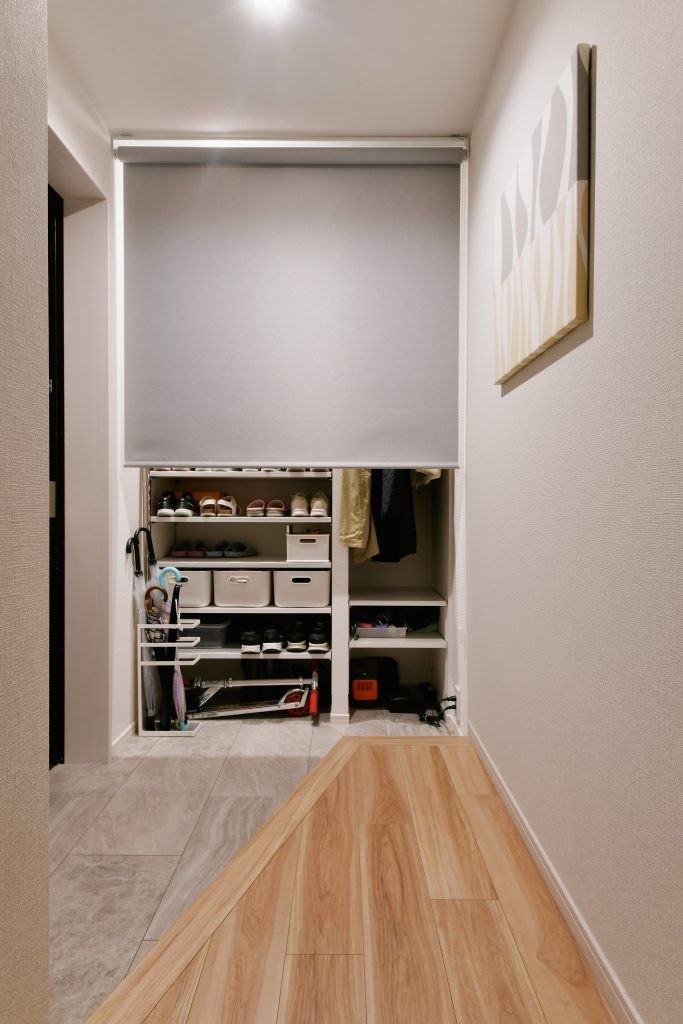 玄関ホール 土間収納には、ロールスクリーンをつけて隠してすっきりと玄関玄関ホール土間収納玄関手洗い自然素材の家木の家石川県白山市小松市梶谷建設kaj_kinoie。