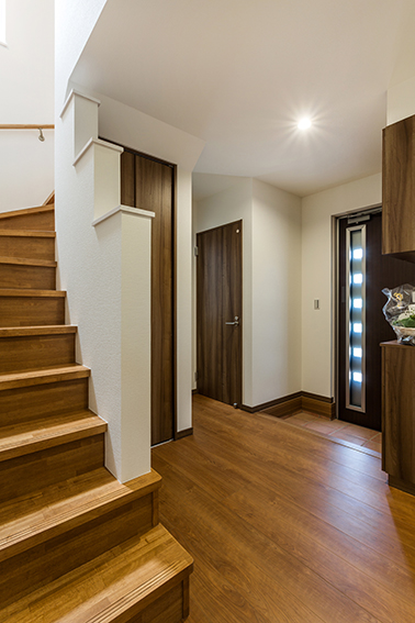 階段下のスペースを土間収納に活用し、収納力をさらにアップ。ご主人の趣味のゴルフやサーフィンの道具もすっきり収納できる。ロールスクリーンを下ろ。