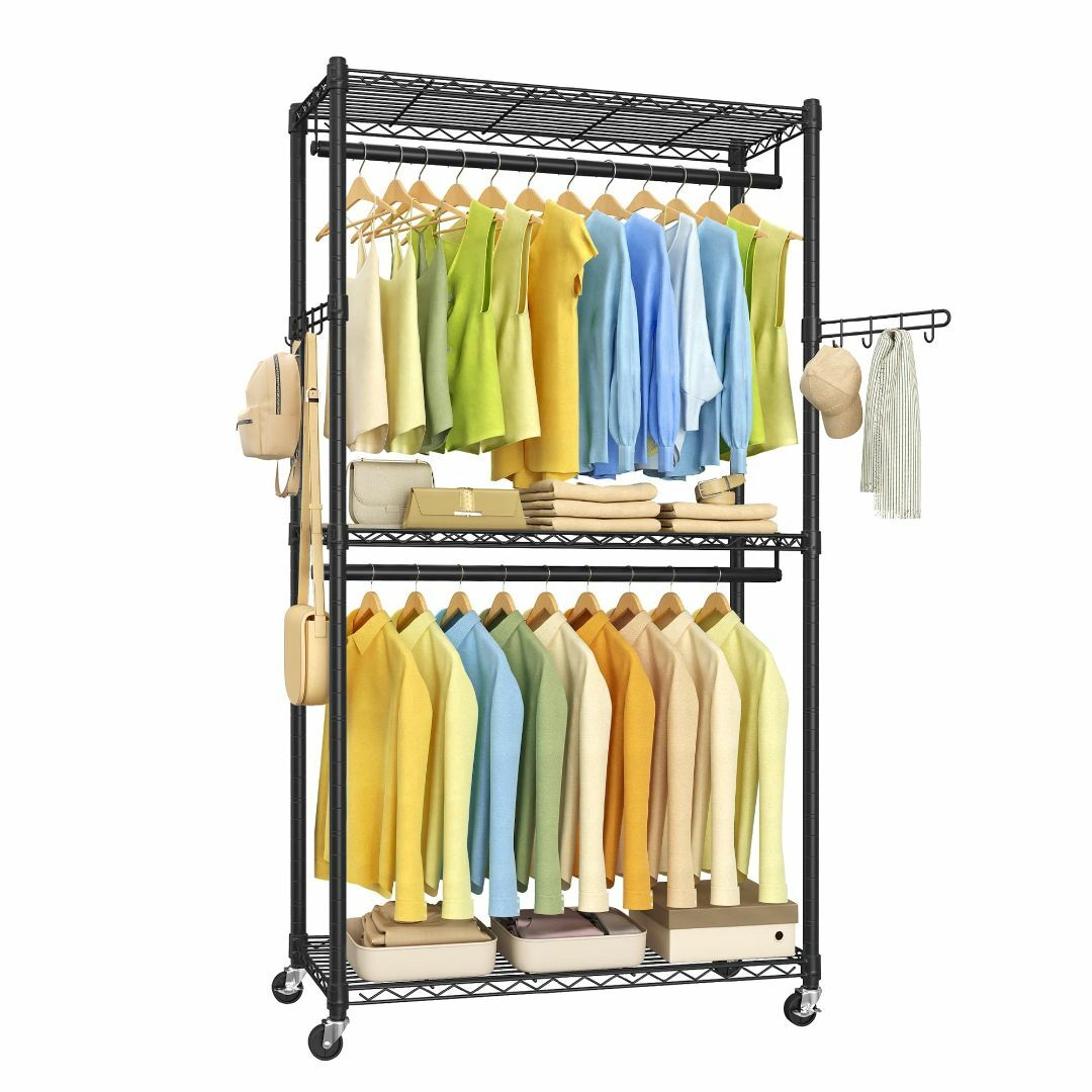 ブラック ハンガーラック 洋服収納 大容量 衣装ケース 棚 アイアンメタル 組み立て簡単!スチールラック。