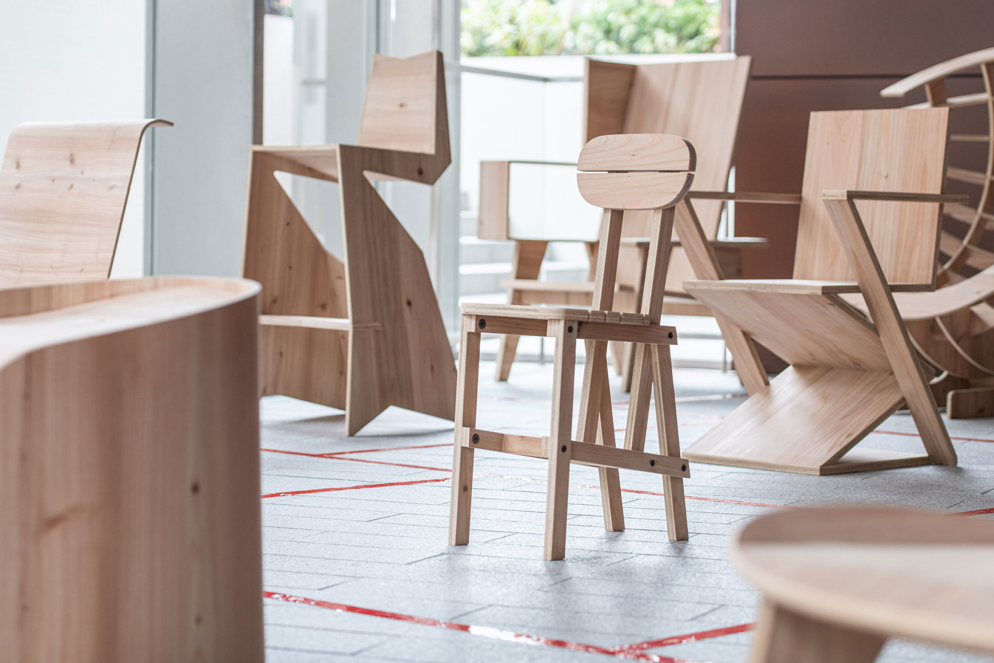 15組の建築家による椅子の展覧会「『建築家の椅子展』~突板合板を用いた椅子の可能性~」の会場写真architecturephoto.net。