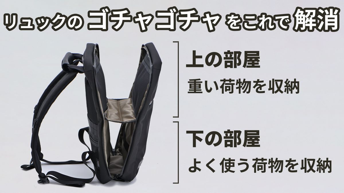 リュックは2段に分けてすっきり解決!必要な物がすぐに出せる!『すっきリュック』マクアケ - アタラシイものや体験の応援購入サービス。