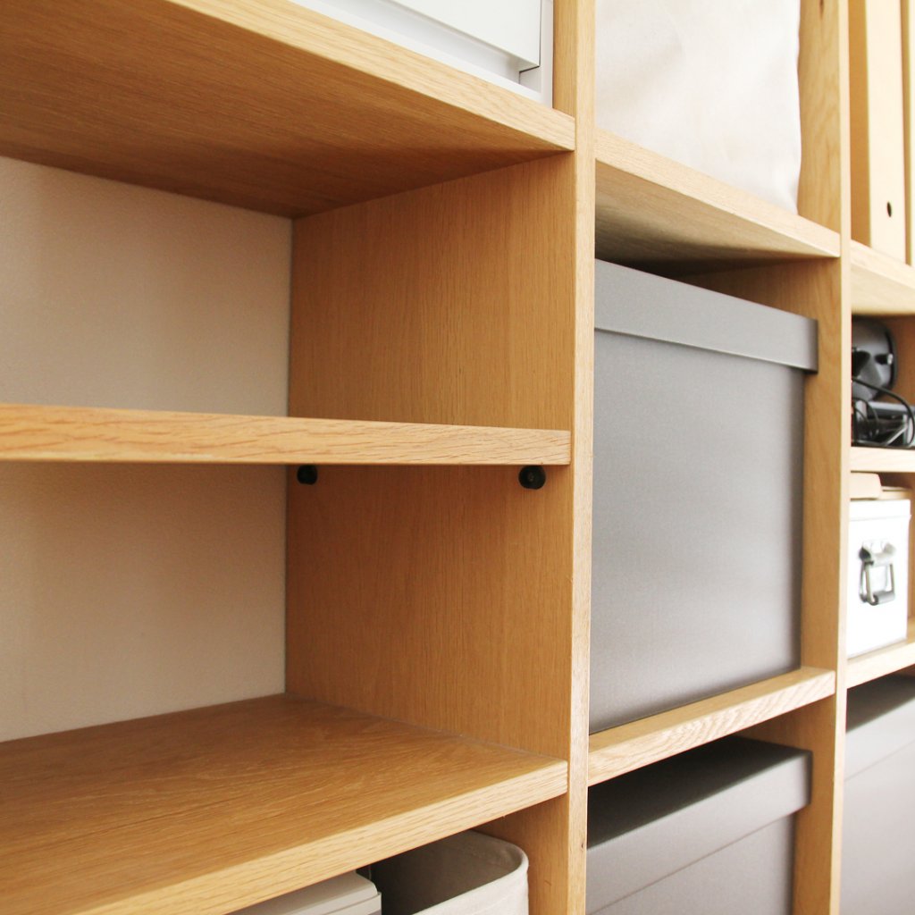 無印良品 スタッキングシェルフ・追加5段オーク材ワイドセット 仕切板2枚おまけ無印良品の棚を100均でDIY!収納力倍増のアイデア。