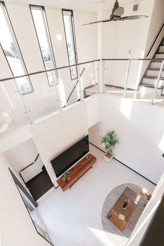 吹抜けに映えるアイアンのスリット階段が住まいの顔、耐震性能抜群の家株式会社井上地所。