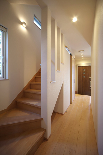 玄関から続くナチュラルな廊下と、圧迫感の無いようにと工夫したスリットが印象的な、明るいデザインの階段 -事例写真「3Fllorインナーガレージのあるここちいい家」注文住宅のハウスネットギャラリ。