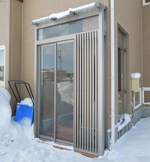 札幌市西区 "後付けの風除室 玄関フード で外階段の雪対策を"※価格情報付公式 札幌トーヨー住器株式会社sapporo-tyj.co.jp。