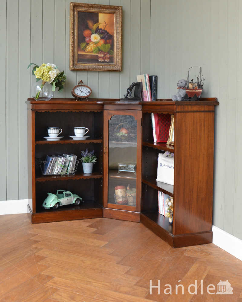 お部屋の角に置くアンティーク家具、コーナーブックシェルフ オープンシェルフ。