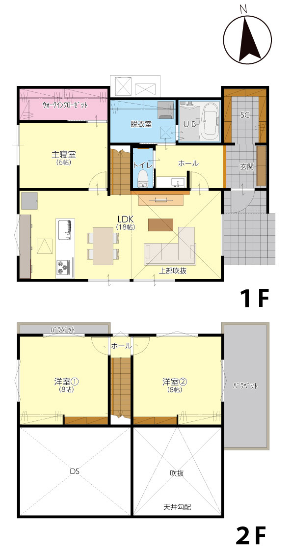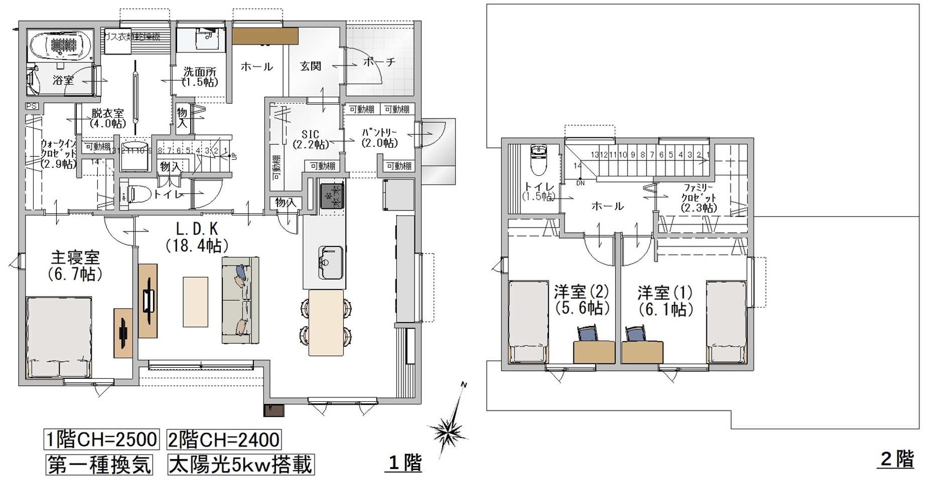 玄関とキッチンが近い、主寝室1階のほぼ平屋間取り。