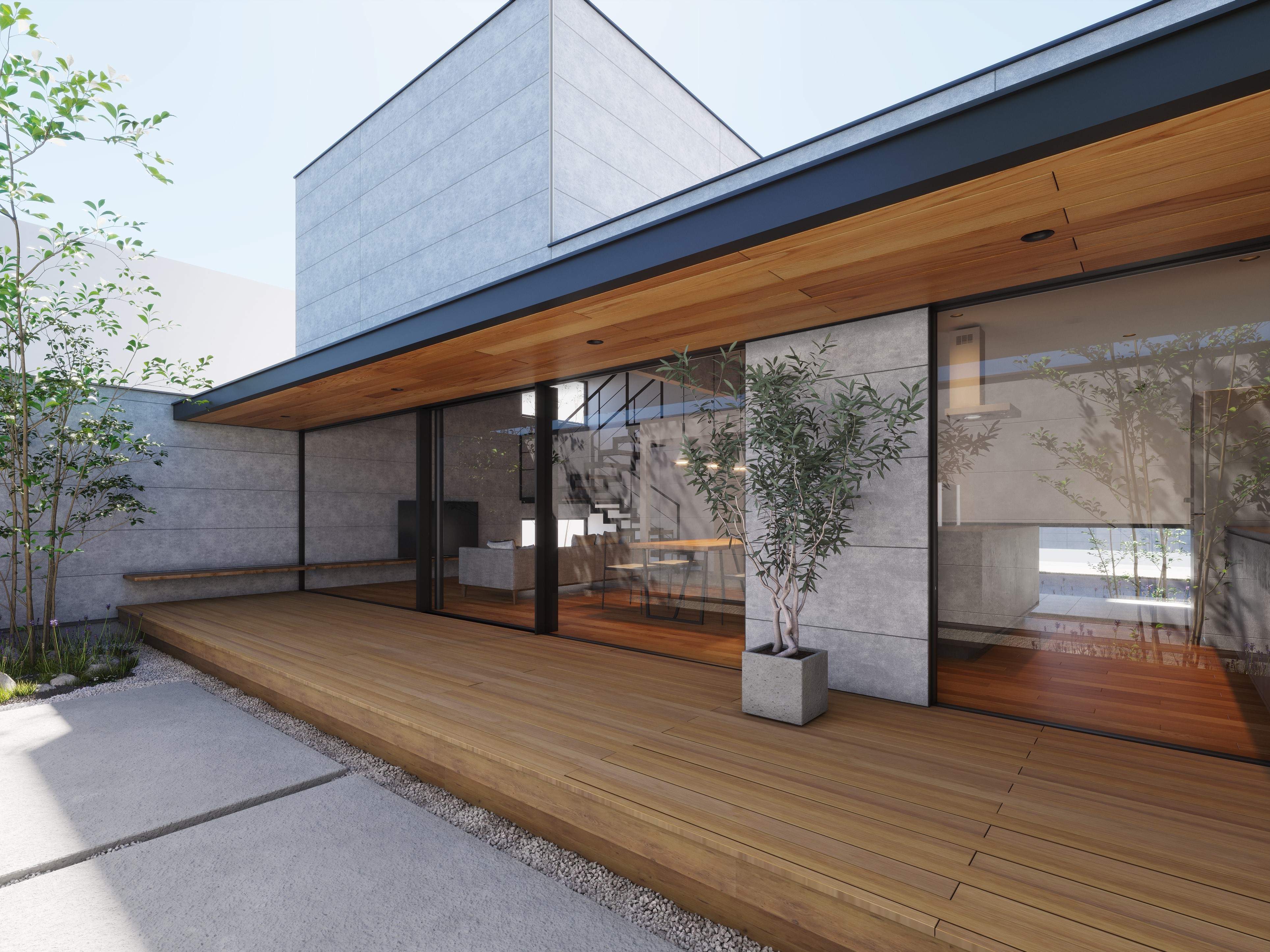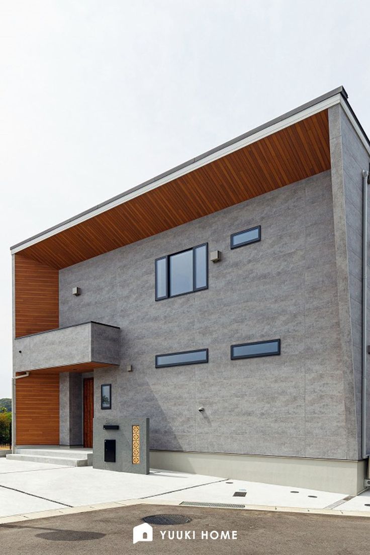 コンクリート調のグレーの外壁×木目の軒天 モダンな外壁 注文住宅 ユウキホーム。