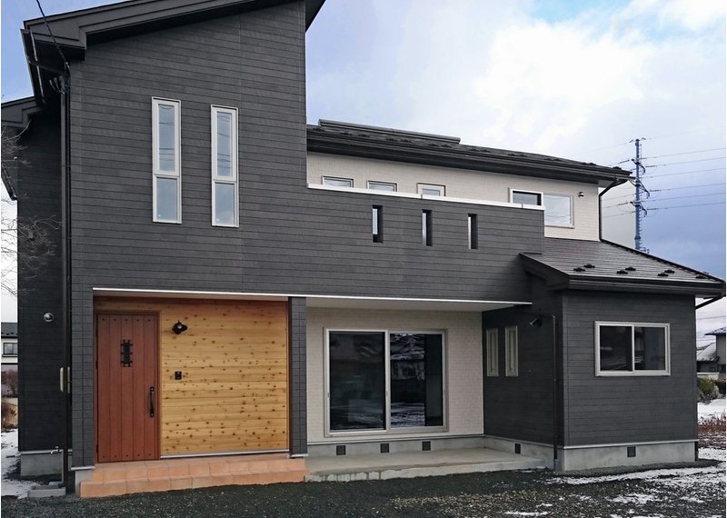 グレー×ブラック のバランスが良い外壁と木目調のドアが 魅力的な施工事例 シンプルなBOX型のプランにさりげない窓配置 ▽青空 ▽サイディング ▽木目調サイディング外観キッチンインテリア施工事例外壁グレー。