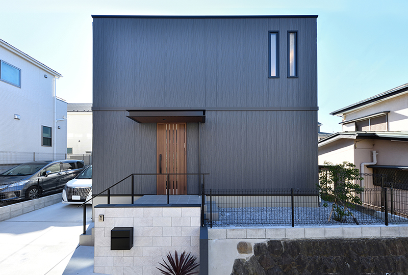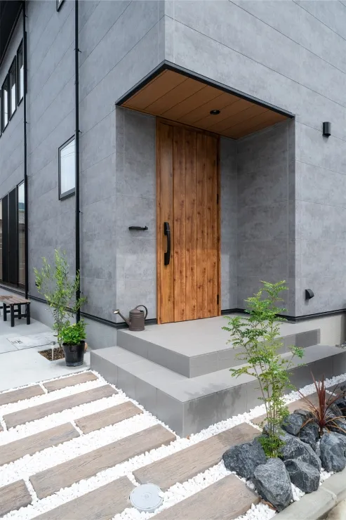 濃いグレーの外壁に木目が映える外観。玄関ポーチの階段を幅広くとり、格調高い雰囲気に住まいるコーポレーションわたしの住まい。