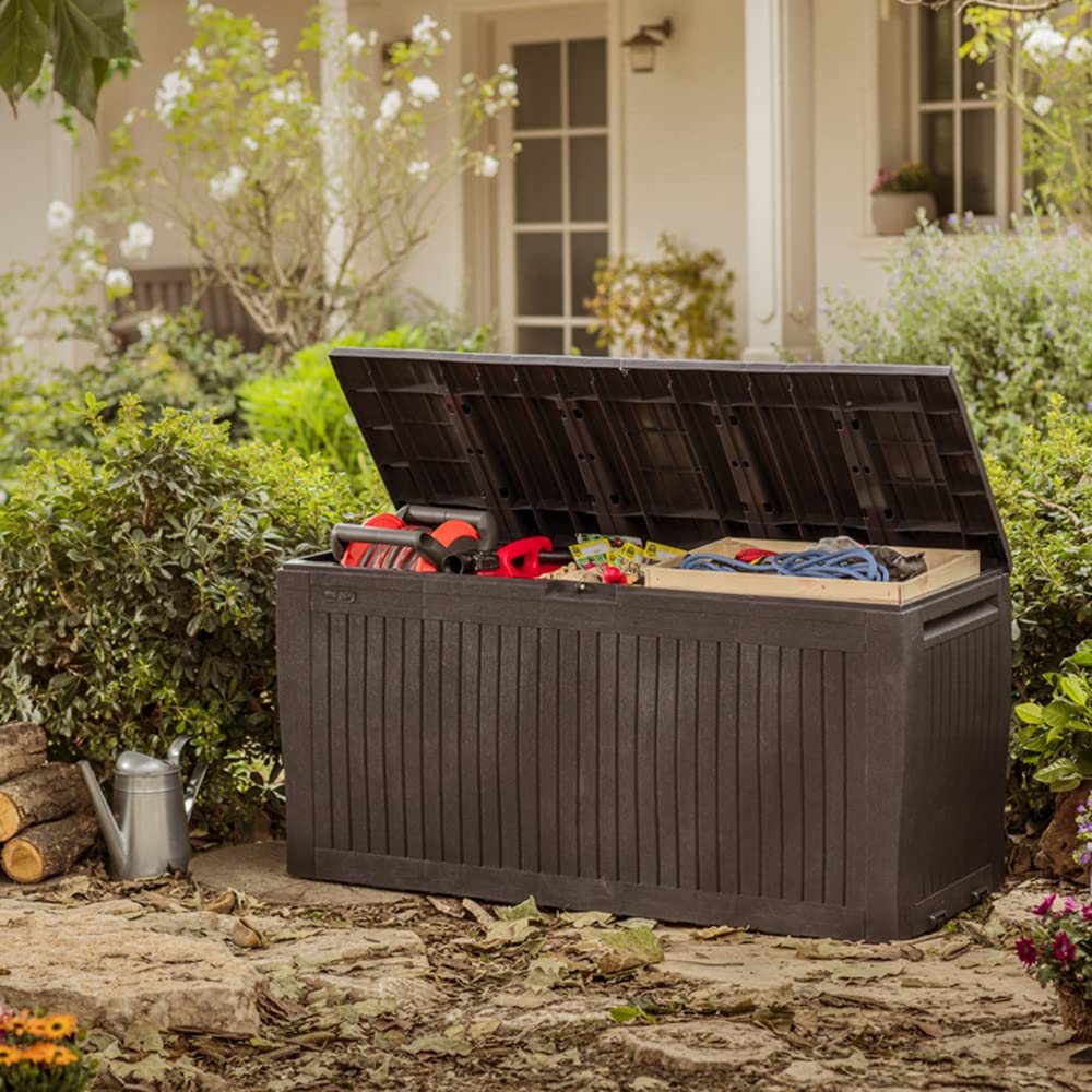 楽天市場 レビュー特典付き 物置 屋外 小型 ゴミ箱 ベンチストッカー 収納ボックス 収納庫 屋外収納庫 ガーデン アウトドア ケター ダーウィンボックス 380L ウッドブラウン グレー 大型宅配便 :DEPOS デポス収納庫 屋外 室内 物置 ベンチ ケター ダーウィン。