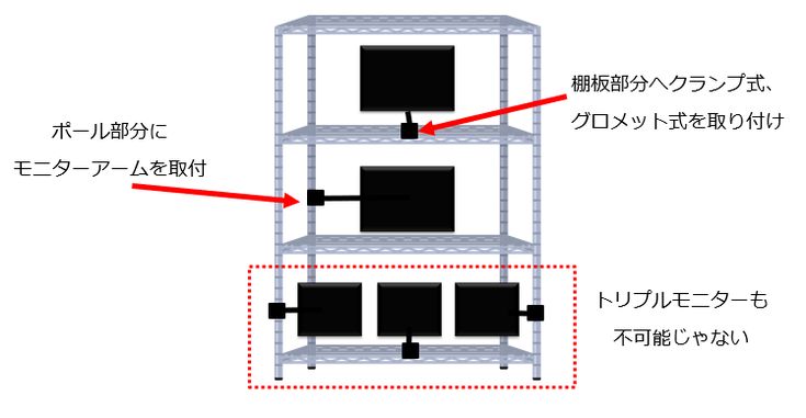 網羅 メタルラック+モニターアームの取付パターン集 クランプ、19mmポールなど。