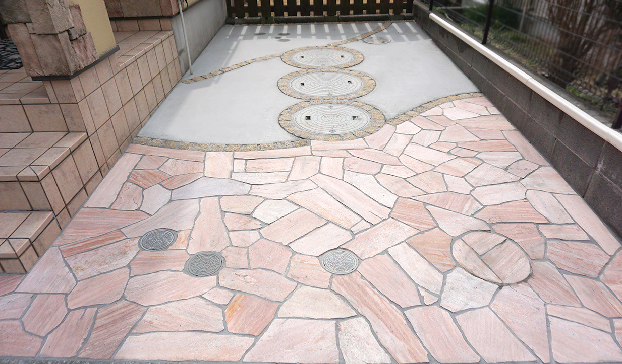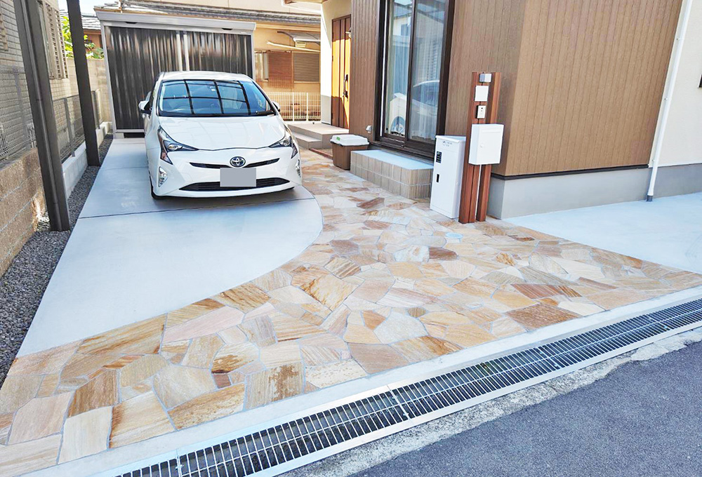 おしゃれに庭の一部としての駐車場拡張 透水性平板舗装外構・エクステリア・造園は庭づくり専門店 愛知県扶桑町 池之上造園へ。
