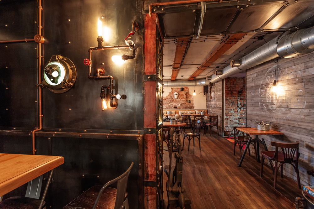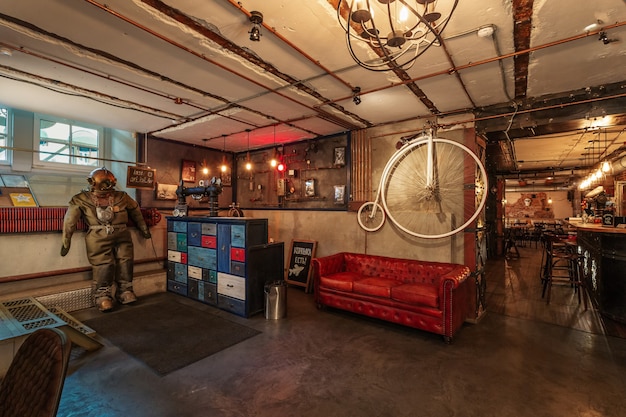 サンクトペテルブルクロシアのパブのスチームパンクなインテリアスタイルPremium写真。