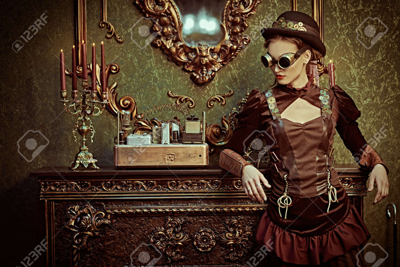 スチームパンクな世界。ビクトリア朝のヴィンテージのインテリアの部屋の暖炉のそばに立っている美しいスチームパンクな女性の肖像画。の写真素材・画像素材Image 169868788。