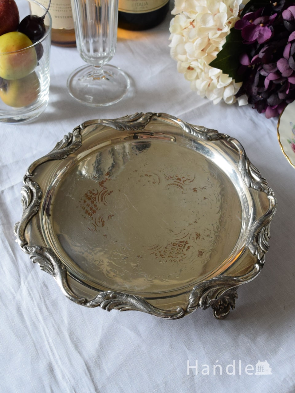 イギリスから届いたアンティークの器、シルバープレートの脚付きサークルトレイ m-7637-z アンティーク雑貨。