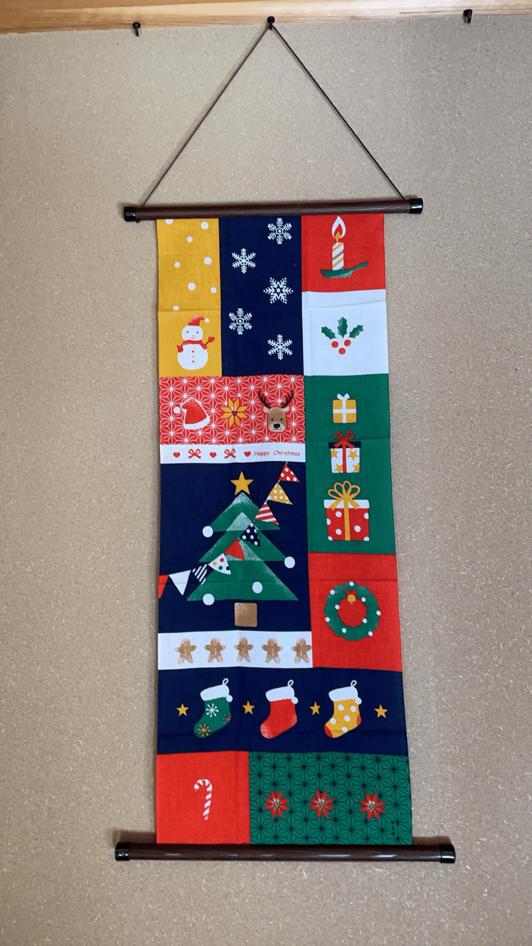 娘からのプレゼント、手ぬぐいのタペストリーを床の間に。クリスマスを待つ時間は楽しいです💗ここぴ。